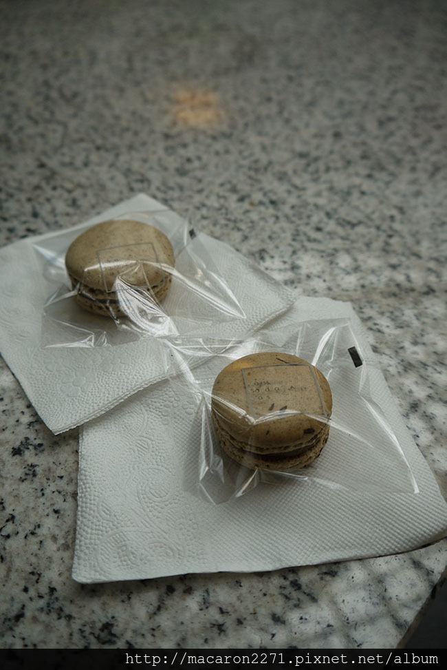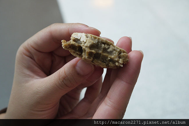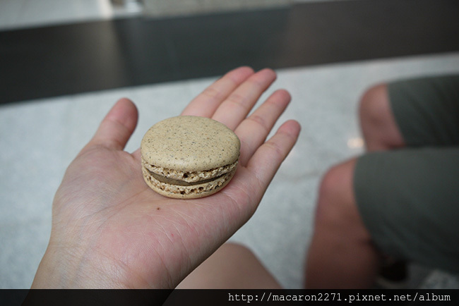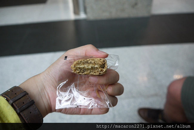 ▼來拍一下斷面,裡面的內餡塞滿滿在馬卡龍中間,餅皮非常酥和綿密滑順的內餡很搭,在我吃過的馬卡龍名單中是前三名^^另一個也是前三名的就是SALON DE THE de Joël Robuchon 侯布雄法式茶點的馬卡龍,在Bellavita百貨3F。