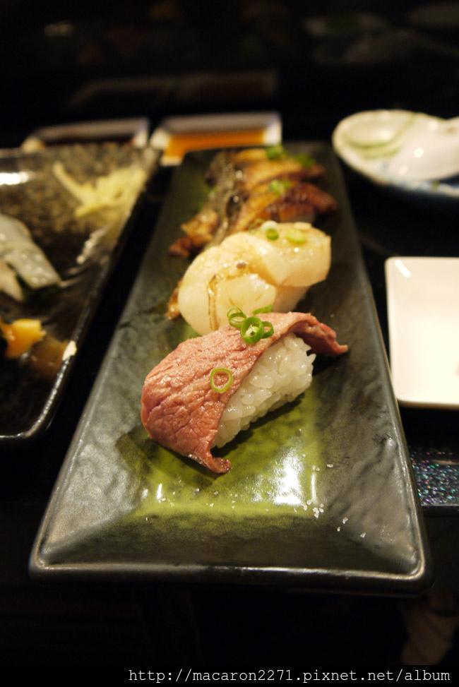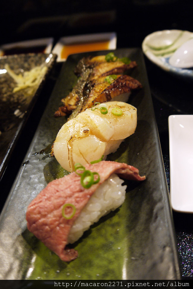 ▼[炙壽司]最前面式醬香和牛、焰燒干貝、最後兩個是店員推薦的鰻魚壽司,