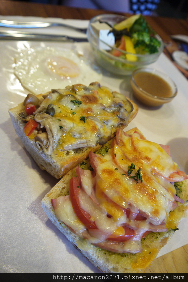 我比較喜歡右邊的,鋪上一片番茄一片培根,麵包塗上一層青醬,這塊很豐富