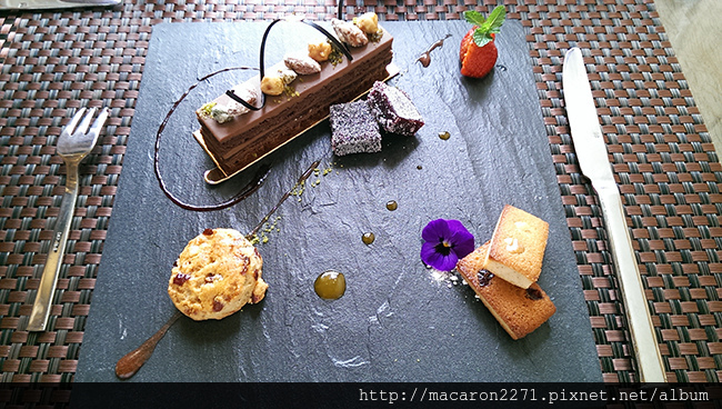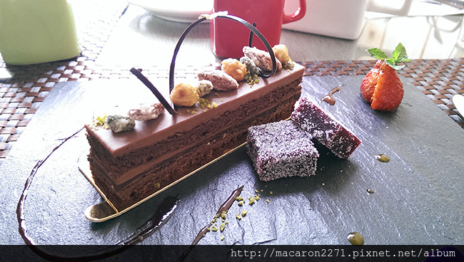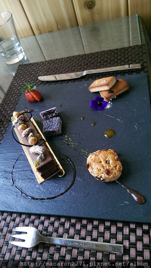 擺盤好美,旁邊以司康、法式軟糖和費南雪點綴,多招待了一個軟糖和費南雪^ ^,榛果巧克力蛋糕口感很特別,夾層中間放了巴芮脆片和榛果醬,很像在吃金莎巧克力一樣