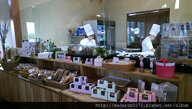 一邊是開放式的廚房,廚房前的展示櫃販售自製的麵包及餅乾