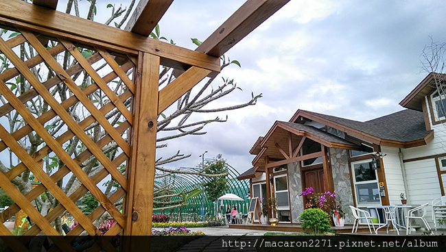 歐式風格的小木屋前有象徵彩虹的入口意象