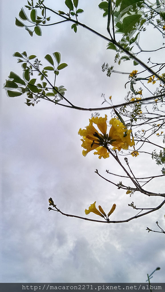旁邊人行道上,樹上開滿了黃花風鈴木的花很美(不小心拍糊了)