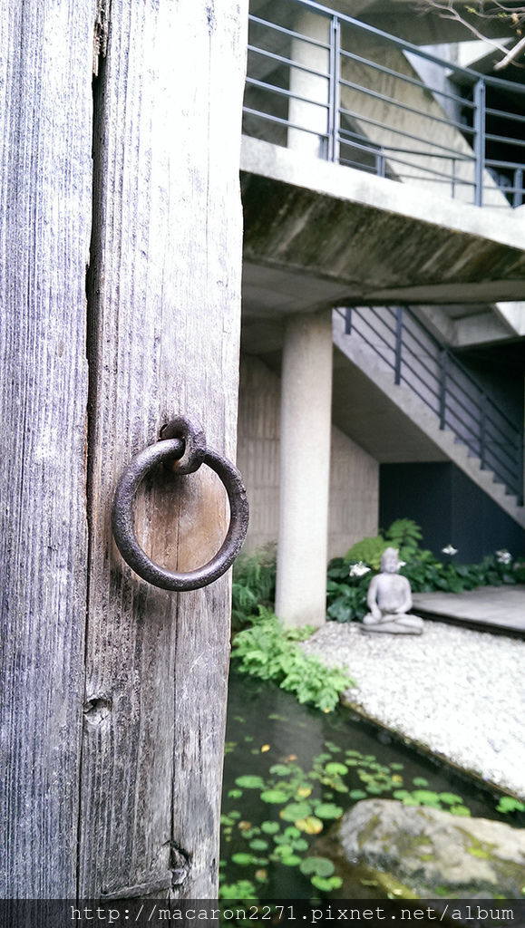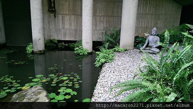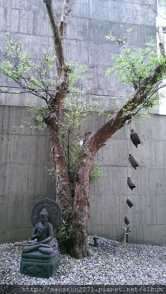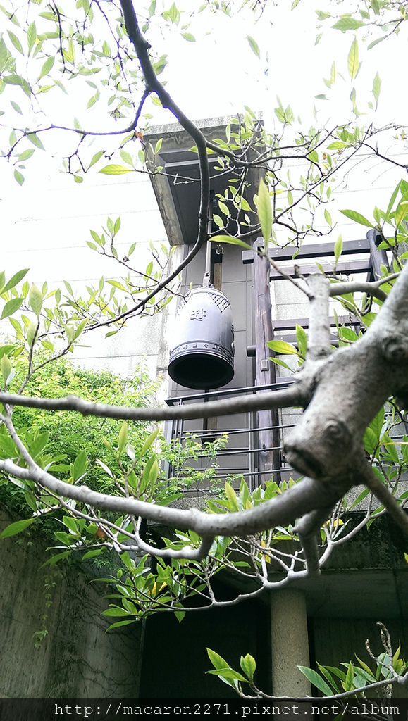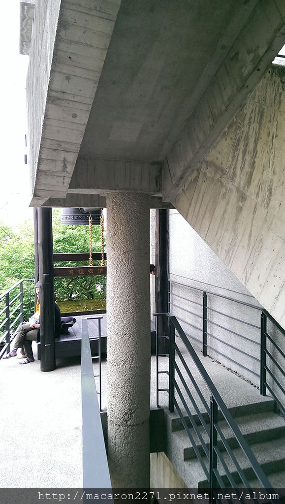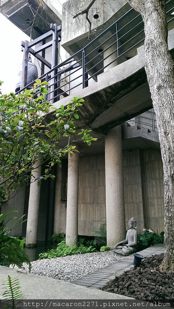 大自然的變化很驚人,三個禮拜前到大里菩薩寺,建築物外的爬牆虎和一樓的烏臼還一片光禿禿,第二次去的時候綠意盎然實在不可思議。有別於一般寺廟宮殿造型的外觀,由半畝塘團隊打造,以簡潔線條的清水模建築佇立在都市空間中,雖然緊鄰馬路邊,但走進寺內,在折返樓梯間人從室內到戶外,再從戶外走進室內,所營造的氛圍讓人心靜下來,遠離都市緊湊生活的壓迫感,細細感受空間與環境的變化。