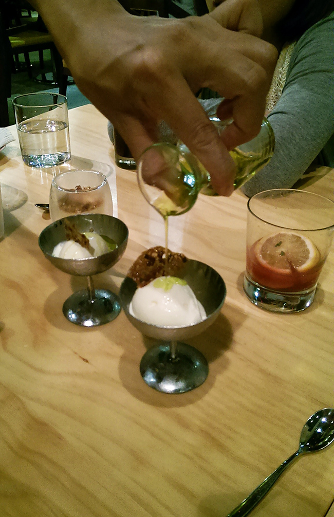 令我們念念不忘的冰淇淋,上次朋友只是稍微離開一下,我們就把冰淇淋嗑到只剩融化的汁,一直記恨到現在,服務生現場淋上橄欖油,橄欖油和香草冰淇淋看起來很不搭嘎的組合,吃起來意外滑順!還有撒上一點鹽之花,鹹鹹甜甜的吃個十球都沒問題~~~上面的焦糖薄片也超好吃