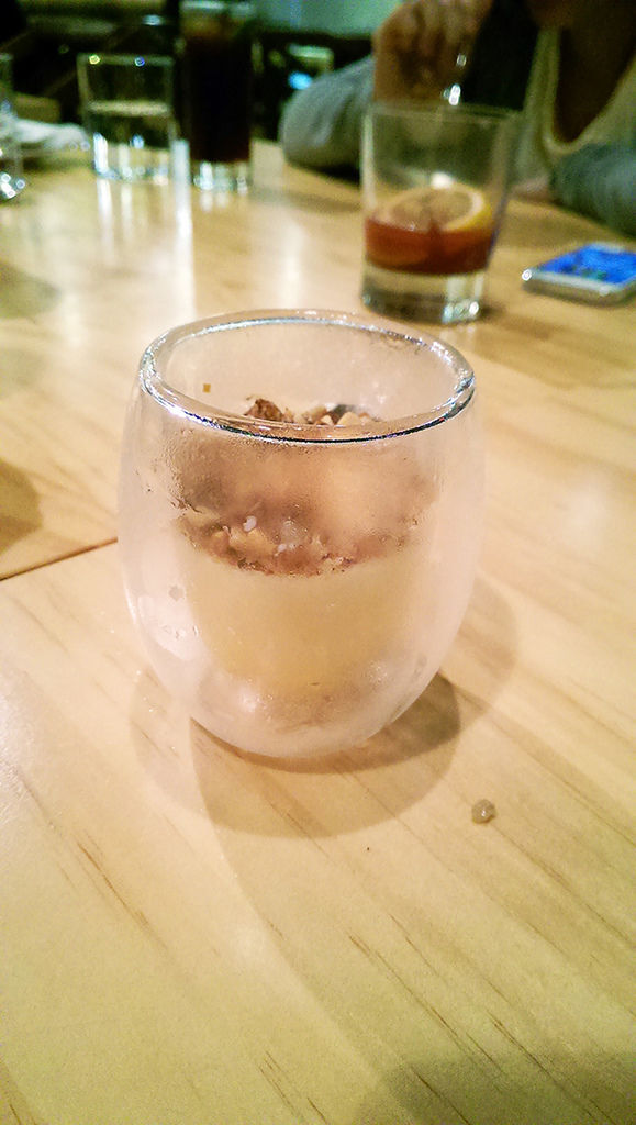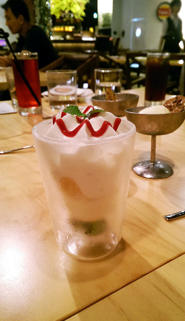 朋友單點一份套餐的煙燻鮭魚沙拉,服務生送來時把蓋著沙拉的玻璃罩打開,濃濃的薰香煙雲冒出,鮭魚上面黑色的是飛魚卵,裡面包著奶油乳酪