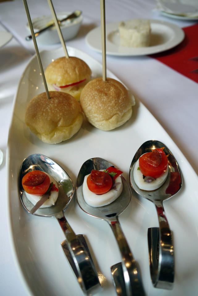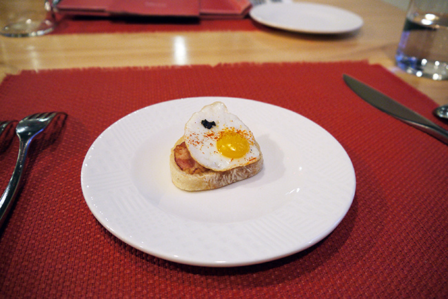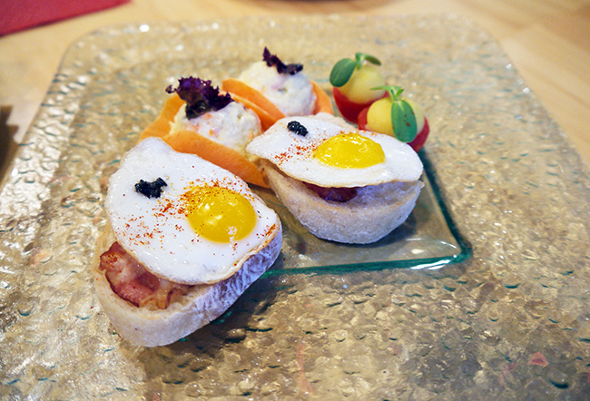 麵包上面放上鵪鶉蛋配培根,鵪鶉蛋黃很像糖心蛋,蛋上面放上一點松露;紅蘿蔔片上面放上馬鈴薯泥;小番茄中間是地瓜球泥,吃起來有百里香的香氣,上面是向日葵苗